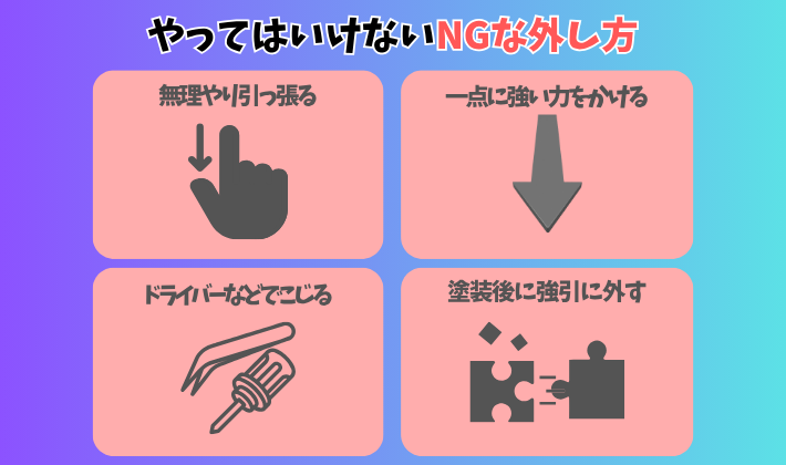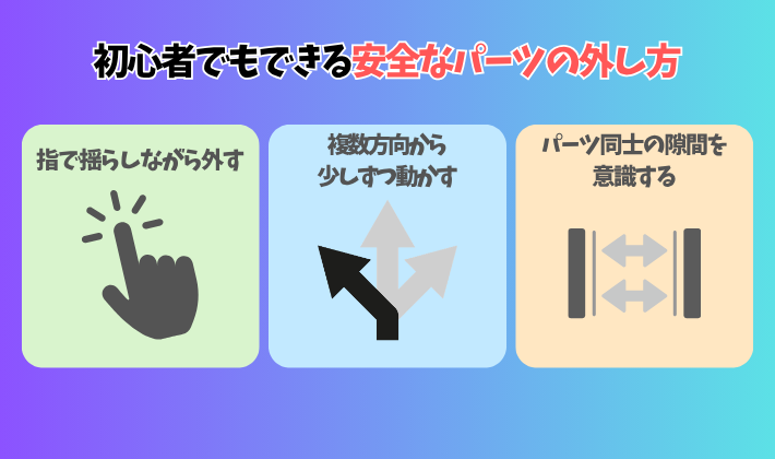 私も最初は無理に外してパーツを傷めた経験がありますが、正しいやり方を知ってからは失敗しなくなりました✨