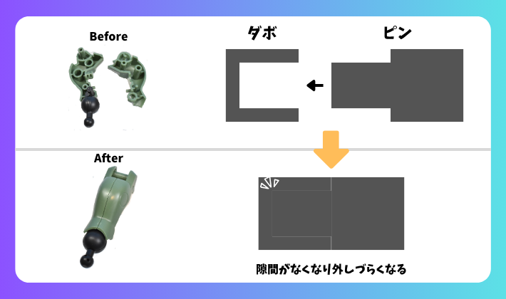 ピン(ダボ)が奥までしっかり差し込まれていると、接触面が増えて摩擦が強くなり、かなり外れにくくなります💦